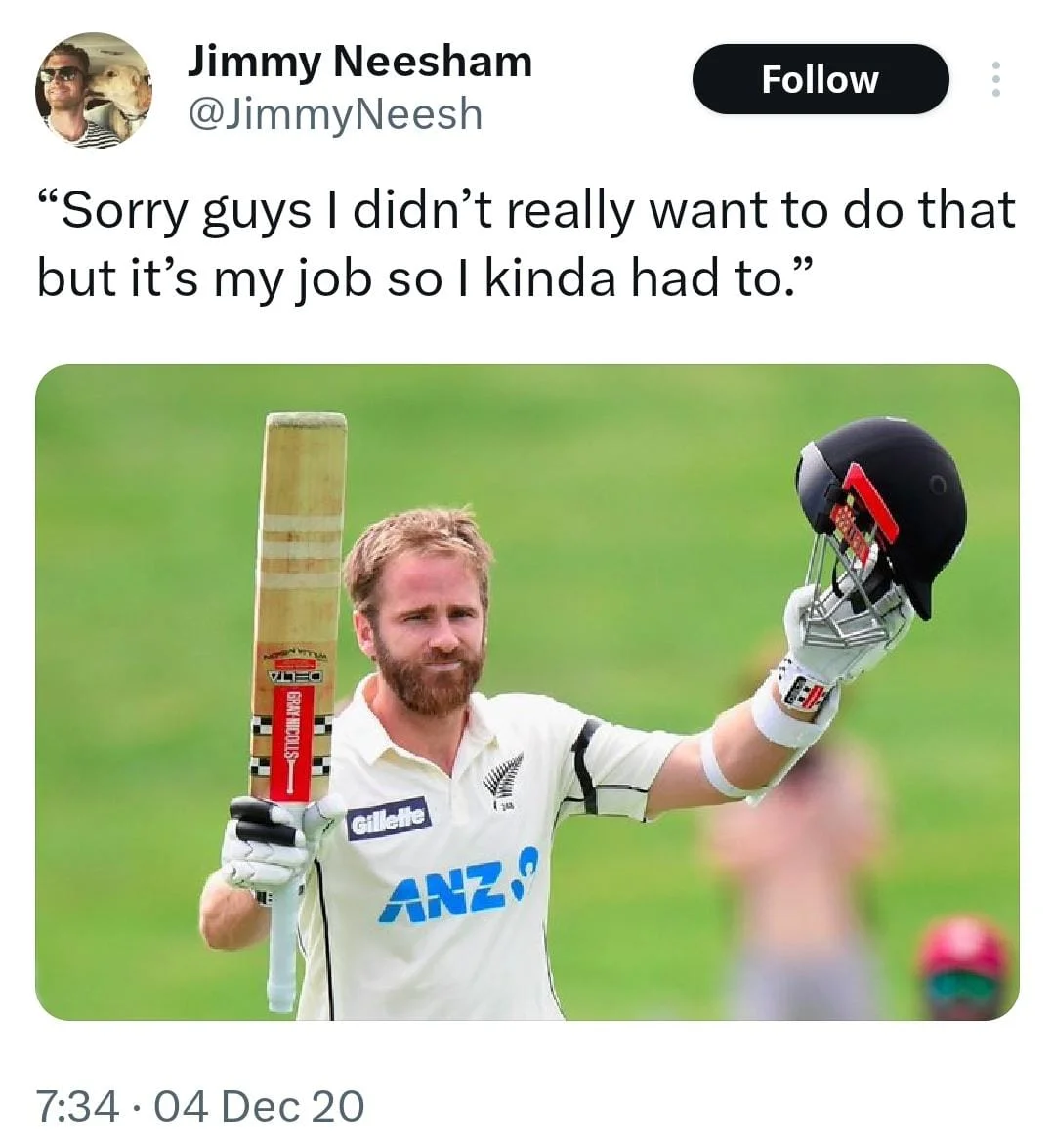 When Kane Williamson knocked out a dizzying 251 against the West Indies, the world cheered like they were at a Beatles reunion. But Jimmy Neesham? He had other plans. He snapped a pic of the star batsman and captioned it: “Sorry guys I didn’t really want to do that but it’s my job so I kinda had to.” Cue the chuckles and guffaws. Was he secretly envious of his captain’s glory? Or maybe it was a playful wink? We’ll never know, but his wit captured the imagination of the Twitterati.