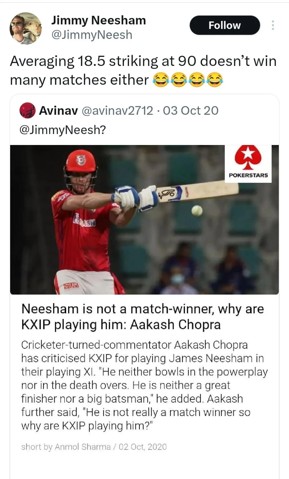 Picture this: Aakash Chopra, a seasoned cricketer turned commentator, hopping onto YouTube to critique Neesham’s performance. “Not really a match-winner,” he says, advocating for Mujeeb ur Rahman instead. Jimmy Neesham, the Twitter whiz, wasn’t having it. He shot back: “Averaging 18.5 striking at 90 doesn’t win many matches either 😂😂😂😂.” Oh snap! With that zinger, he did more than just defend his honor; he made Chopra the roast of the day.