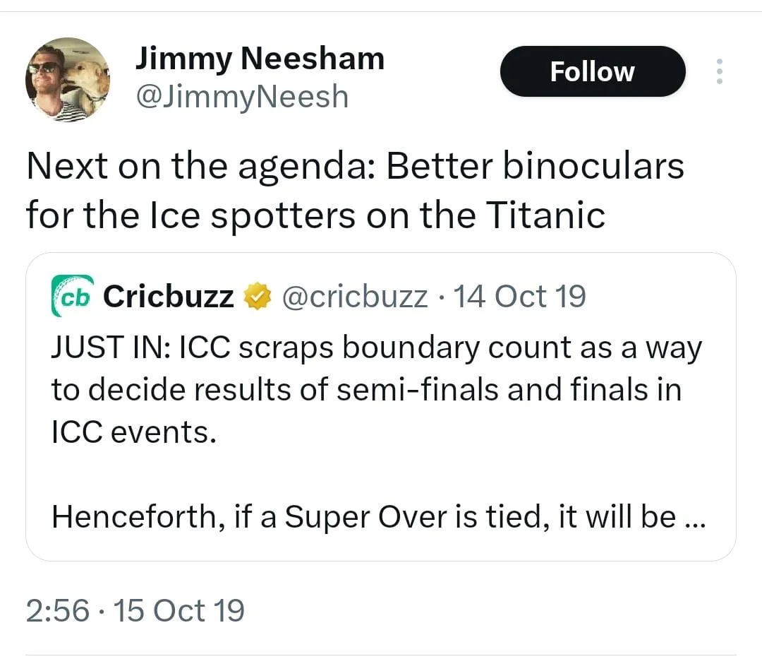 Ah, the 2019 World Cup, a knife still stuck in the heart of many a New Zealander. When the ICC decided to tweak the super-over rule, you bet Neesham had something to say. He chimed in: “Next on the agenda: Better binoculars for the Ice spotters on the Titanic.” A perfect blend of tragedy and comedy. Comparing the late rule change to the futile efforts on the Titanic was nothing short of Twitter gold. It was a laugh-or-cry moment that Neesham nailed to a T.