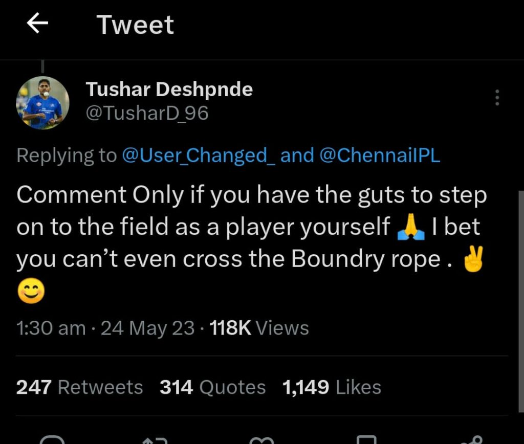 Recently, after a forgettable bowling performance by Tushar Deshpande in the Qualifier 1 against GT, he was trolled by many on social media. Frustrated by this, Deshpande gave one troller this reply.
