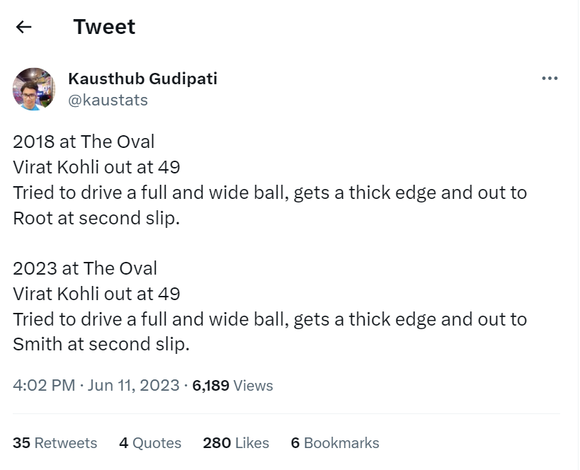 A Twitter statistician Kausthub Gudipati recalled a similar incident at The Oval from India’s 2018 tour of England, where Kohli was out driving on the score of 49, edging to the second slip.