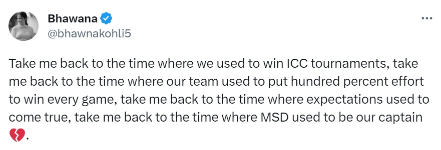 “Take me back to the time where we used to win ICC tournaments, take me back to the time where our team used to put hundred percent effort to win every game, take me back to the time where expectations used to come true, take me back to the time where MSD used to be our captain💔.”