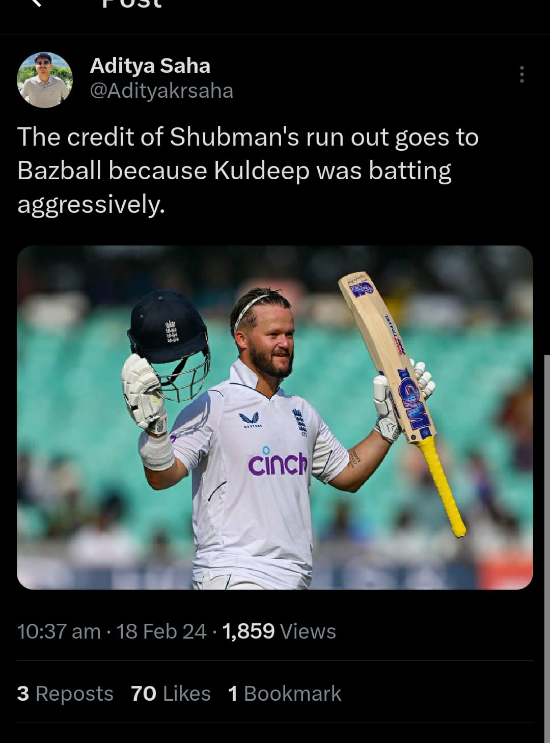 Kuldeep Yadav, who had batted impressively today, played an on drive to Tom Hartley and called for a quick single. The non-striker, Gill, responded Kuldeep’s call and was almost halfway down the pitch when Kuldeep saw Ben Stokes at mid-on pick up the ball and aborted the run. Gill turned around and sprinted back and even put in a big dive, but Hartley had collected the throw from Stokes and dislodged the bails by then.