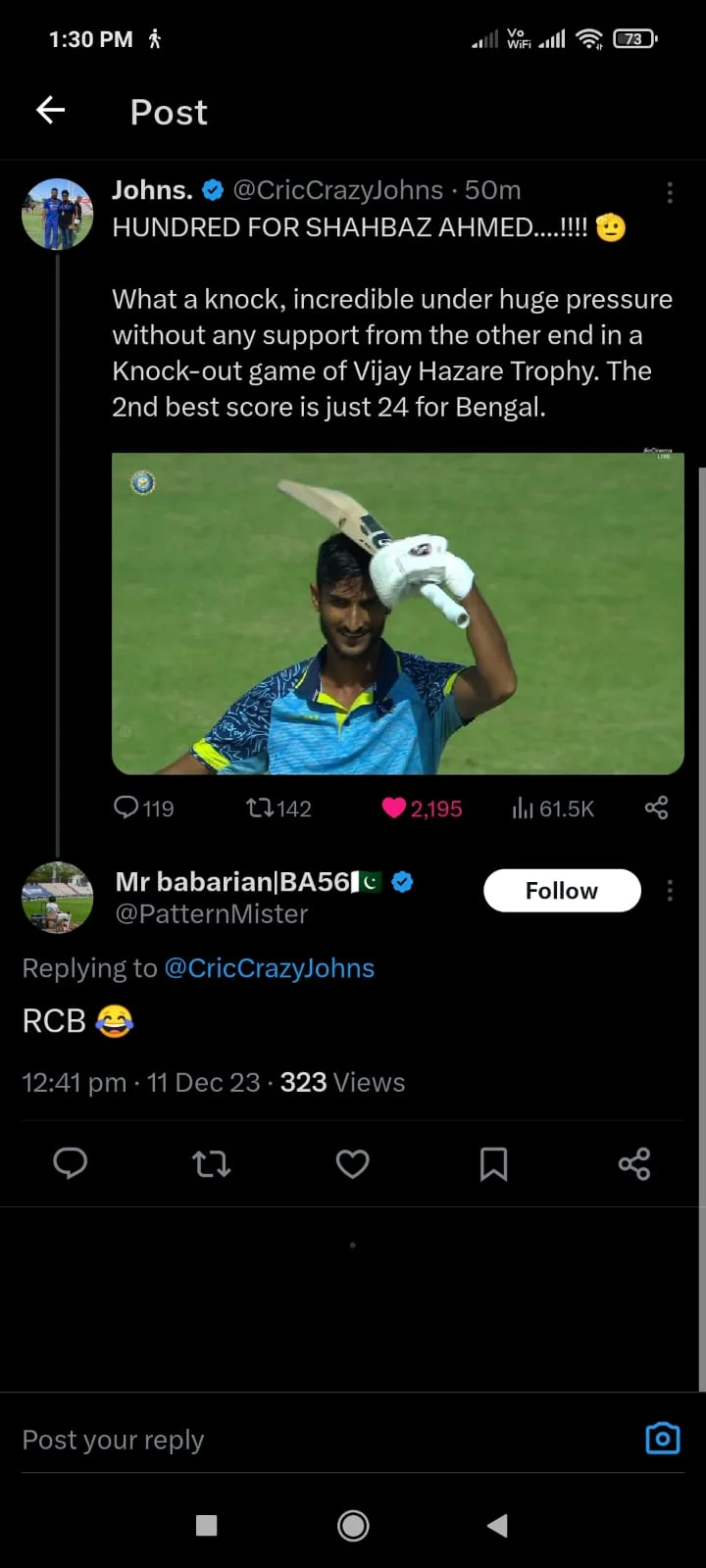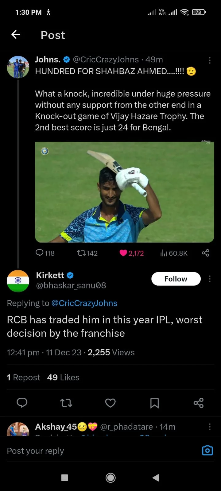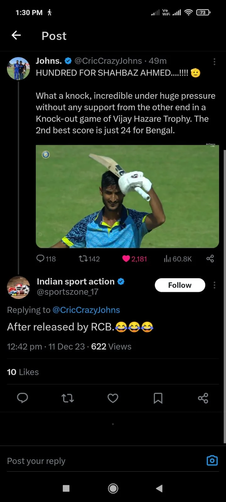 Will the Royal Challengers Bangalore (RCB) be made to rue their decision of trading away Shahbaz Ahmed to the Sunrisers Hyderabad (SRH)? The fans seem to think so as Shahbaz Ahmed hit a brilliant century in the Vijay Hazare Trophy quarter-finals after being traded away by RCB.