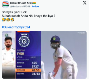 Cricketing world, where every move on the pitch can spark a thousand conversations,decision of Shreyas Iyer to bat with sunglasses during the Duleep Trophy 2024 match became more than just a fashion statement; it turned into a social media phenomenon. This unconventional choice not only caught the eye of spectators but also ignited a firestorm of reactions across platforms, particularly on X (formerly Twitter), where fans and critics alike had their say.