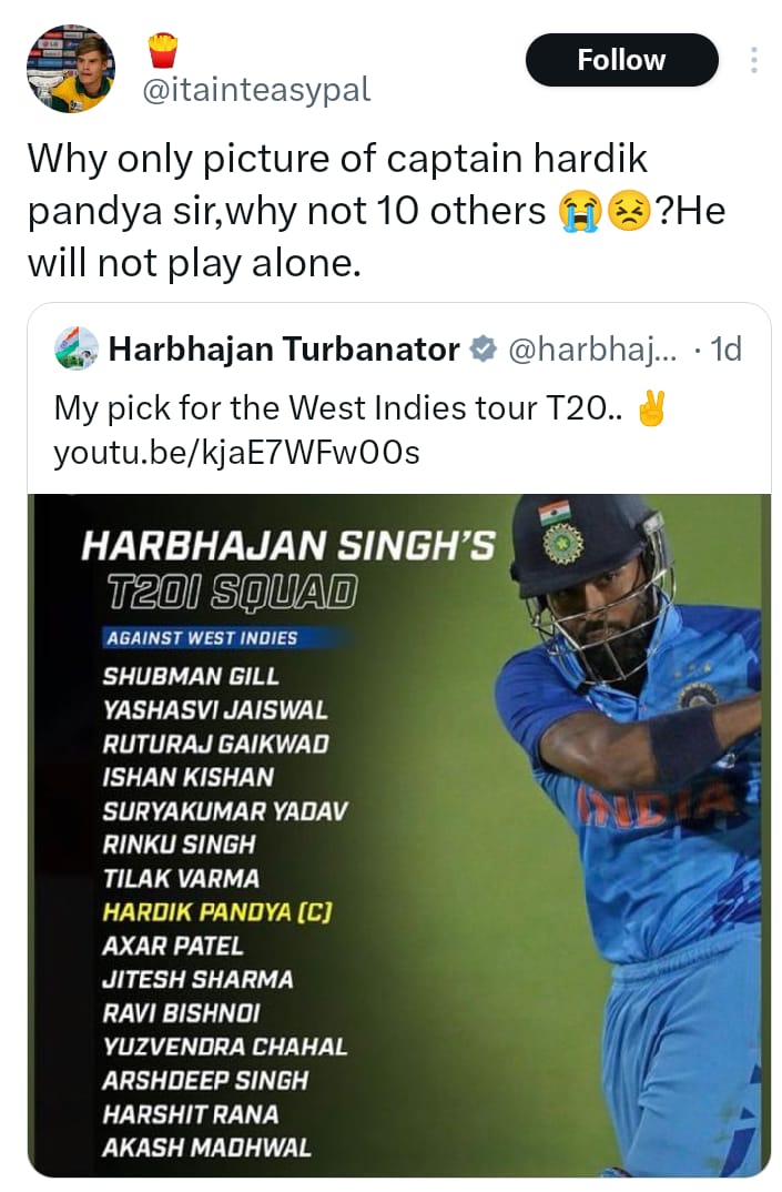 Harbhajan has named Hardik Pandya as the captain of his side and has left out senior batters including Rohit Sharma and Virat Kohli, saying that they all deserve to be rested. Instead, he has included young players such as Yashasvi Jaiswal, Rinku Singh, and Tilak Varma, all of whom impressed during the recently concluded 2023 edition of the Indian Premier League.