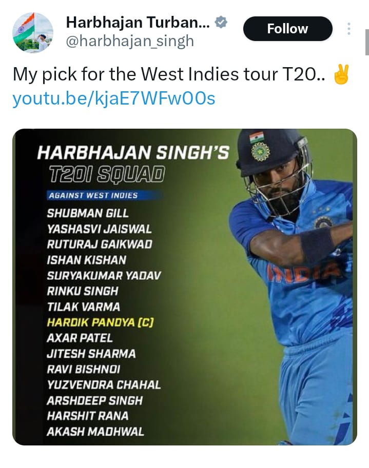 On Wednesday, former Indian spin wizard Harbhajan Singh revealed his 15-man Indian squad for the upcoming T20I series against West Indies.