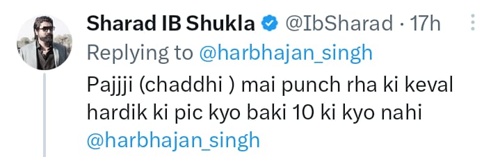 Harbhajan was quick to notice the tweet and come up with a reply to the fan, saying that the other 10 players played an important part in those achievements because ultimately cricket is a team sport. He wrote: