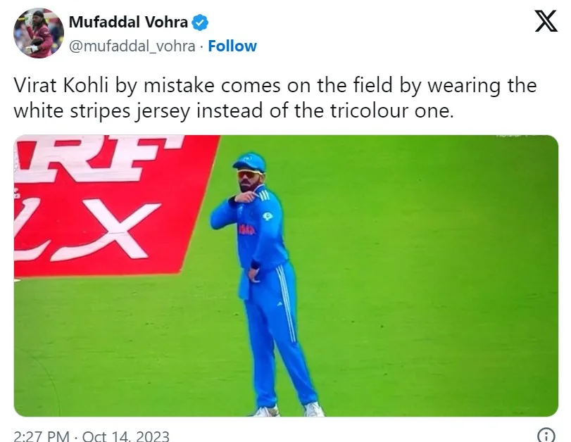 The Indian batting superstar Virat Kohli had to leave the field for some time during the World Cup 2023 clash between India vs Pakistan at the Narendra Modi Stadium for some hilarious reasons. Kohli was spotted wearing the wrong jersey during the game.