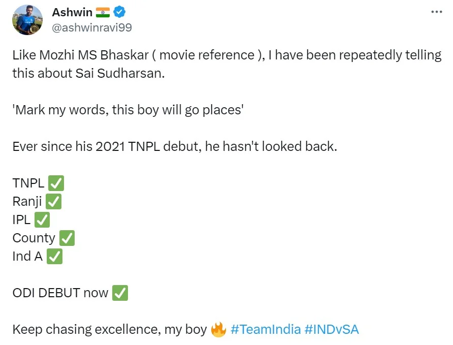 Ashwin’s words are now proving to be accurate, as the young opener scored a half-century in his debut One Day International (ODI) match against South Africa in the first ODI held in Johannesburg. Sai played an unbeaten knock of 55 runs off 43 balls, smashing 9 fours.