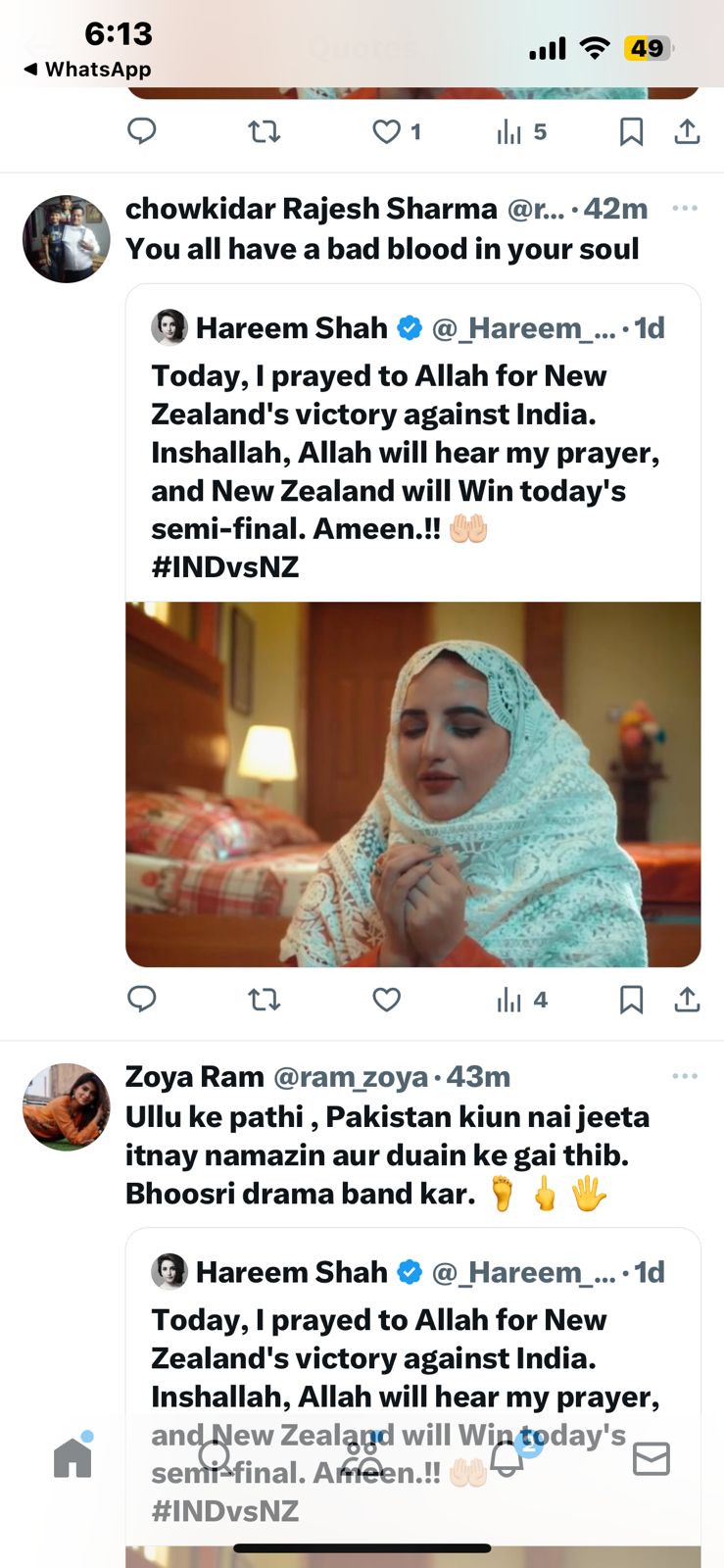 Amidst the fervor of India’s stellar performance, a controversial incident unfolded on social media. A Pakistani journalist, identified as Hareem Shah, expressed a seemingly envious sentiment just before the crucial matches. In a tweet, she openly wished for India’s defeat, praying for New Zealand’s victory.