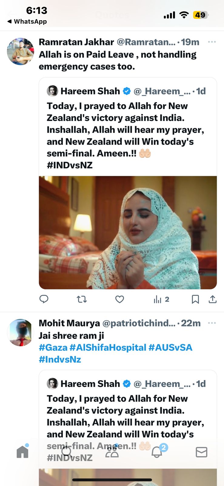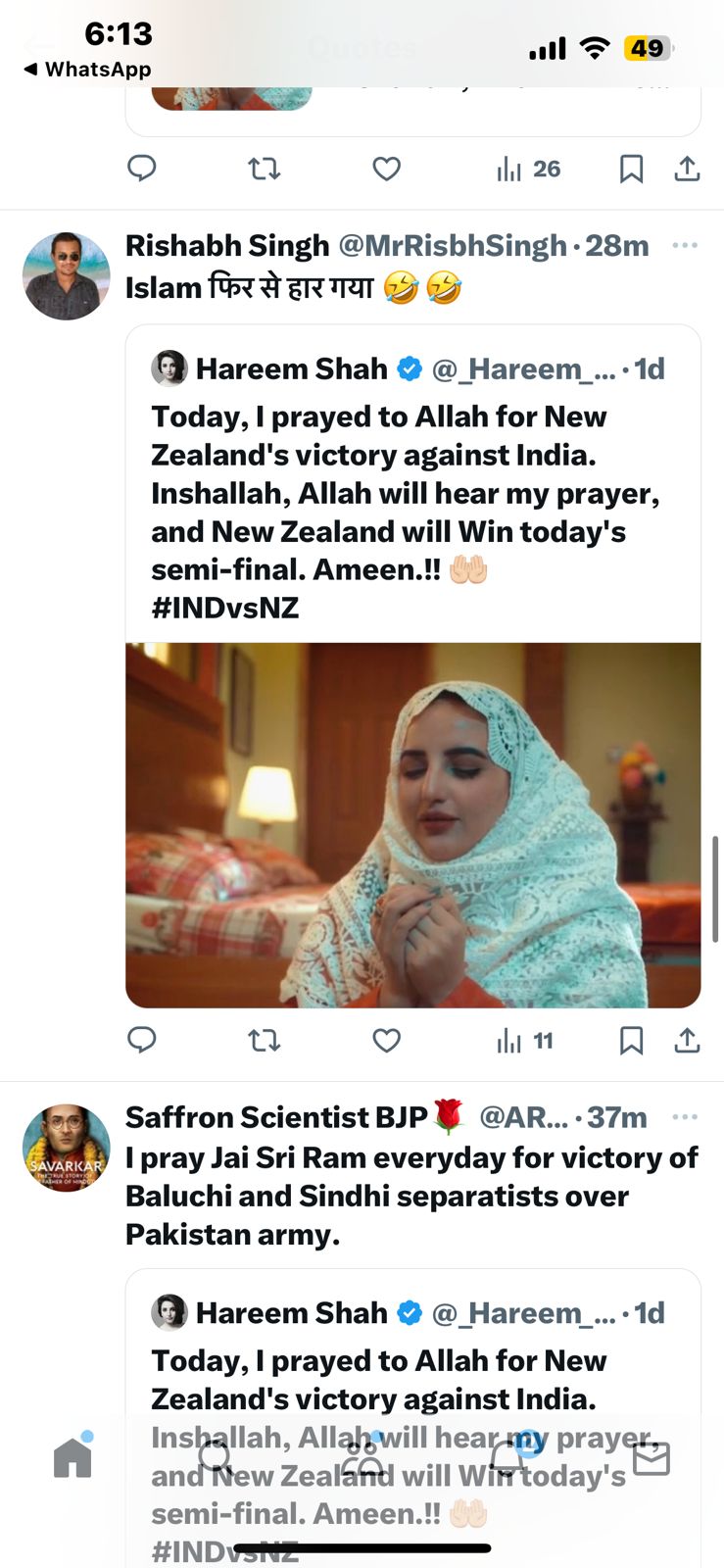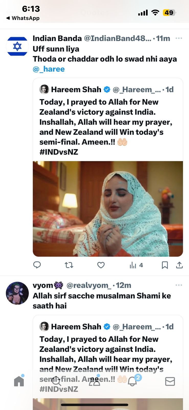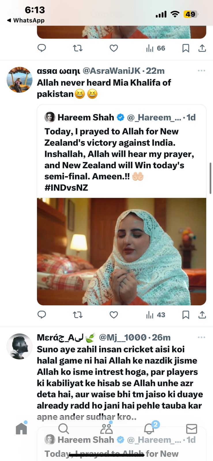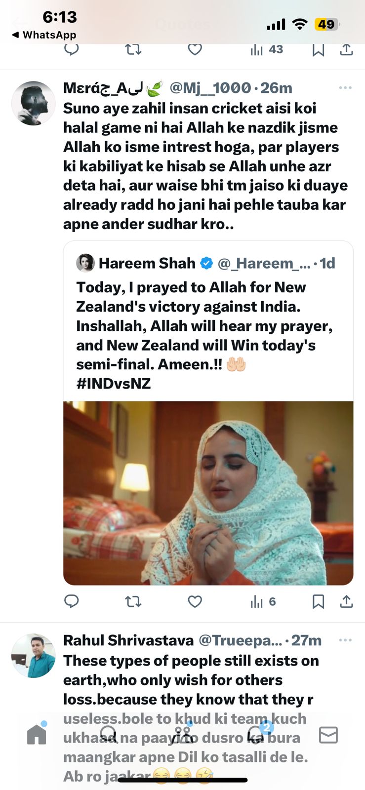 She wrote, “Today, I prayed to Allah for New Zealand’s victory against India. Inshallah, Allah will hear my prayer, and New Zealand will Win today’s semi-final. Ameen.!! #INDvsNZ”