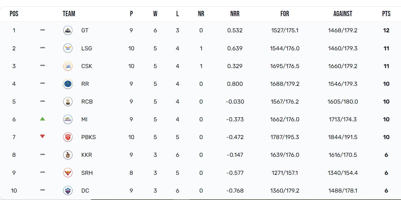 Sunday’s afternoon match between Lucknow Super Giants and Chennai Super Kings, in Lucknow, was washed out. Both the teams took 1 point each and are now with 11 points in 10 matches; LSG at second position and CSK at 3rd while Gujarat Titans lead the points table with 12 points in 9 games.