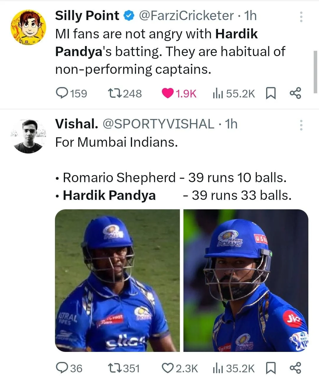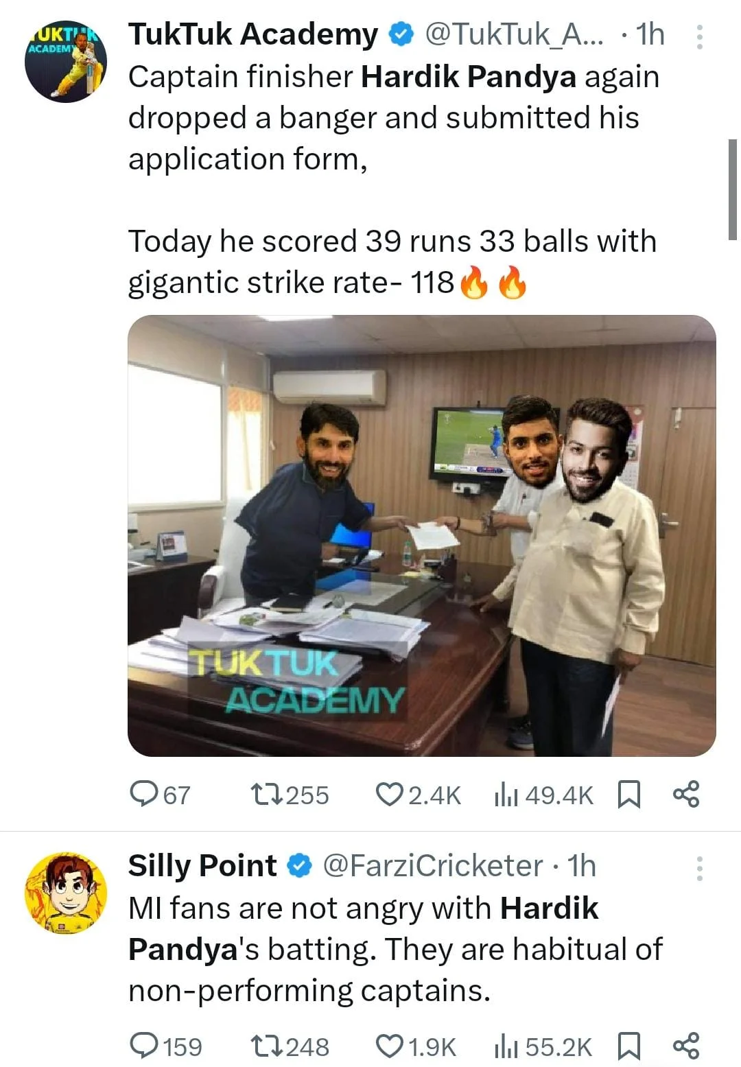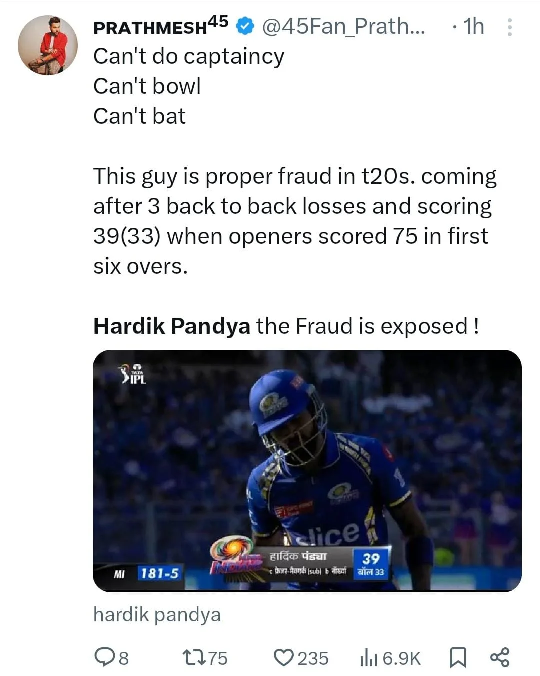 Fans on social media are now trolling Hardik left, right, and center for his yet another flop show with the bat. Check out the reactions of the fans here: