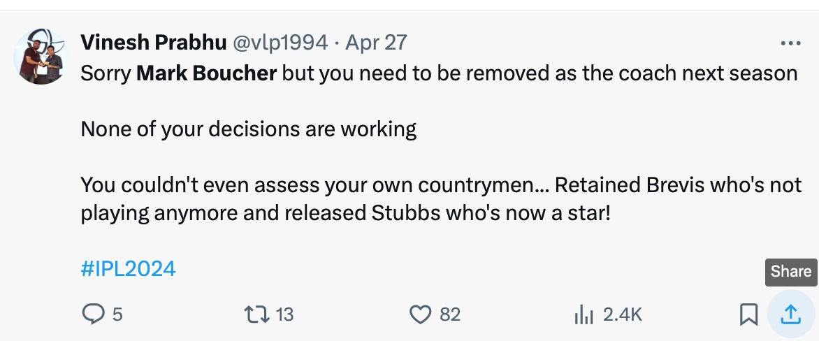 Entraged supporters accused Boucher of destroying the Mumbai Indians’ formidable team by himself. About Boucher’s managerial style and its potential effects on the team’s future, conjecture abounded. Fearing for the team’s performance and identity under Boucher’s direction, the once-loyal fan base now questioned every move.