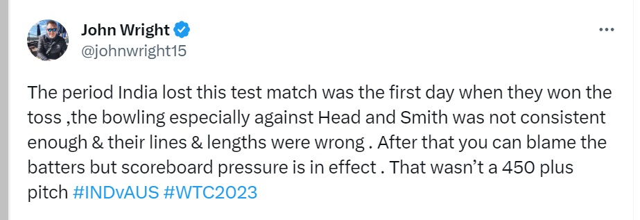 “The period India lost this test match was the first day when they won the toss ,the bowling especially against Head and Smith was not consistent enough & their lines & lengths were wrong . After that you can blame the batters but scoreboard pressure is in effect . That wasn’t a 450 plus pitch #INDvAUS #WTC2023”