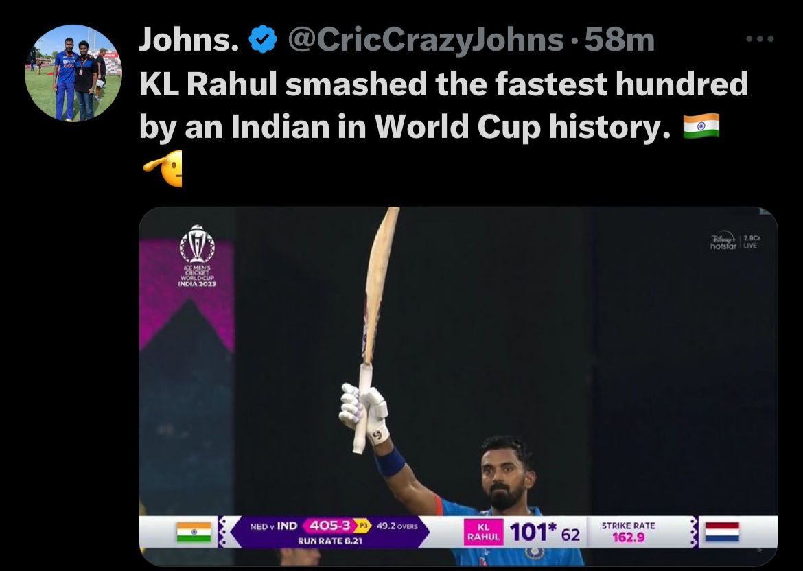 In cricket, records are meant to be broken. In a game where every run counts, a remarkable feat that lingers in the memory of cricketfans worldwide is KL Rahul’s record-breaking century during the World Cup. This historic moment unfolded on the cricket pitch in Bengaluru, India, during a match against the Netherlands. KL Rahul’s remarkable innings set a new standard for Indian batsmen, as he achieved the fastest century in a World Cup, taking just 62 deliveries to reach this milestone.