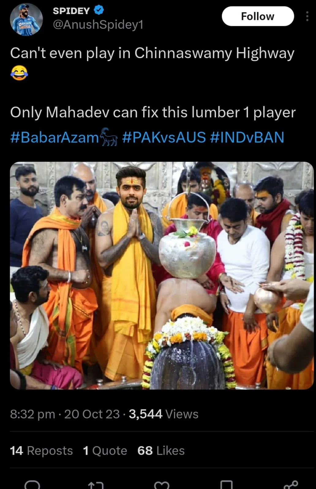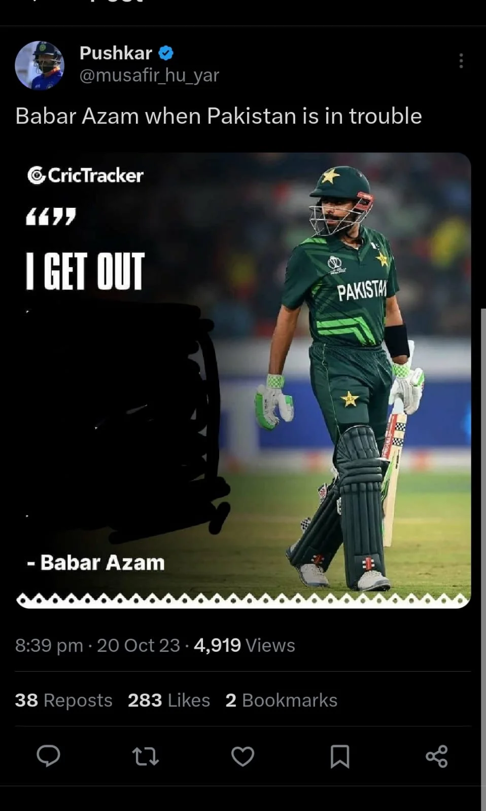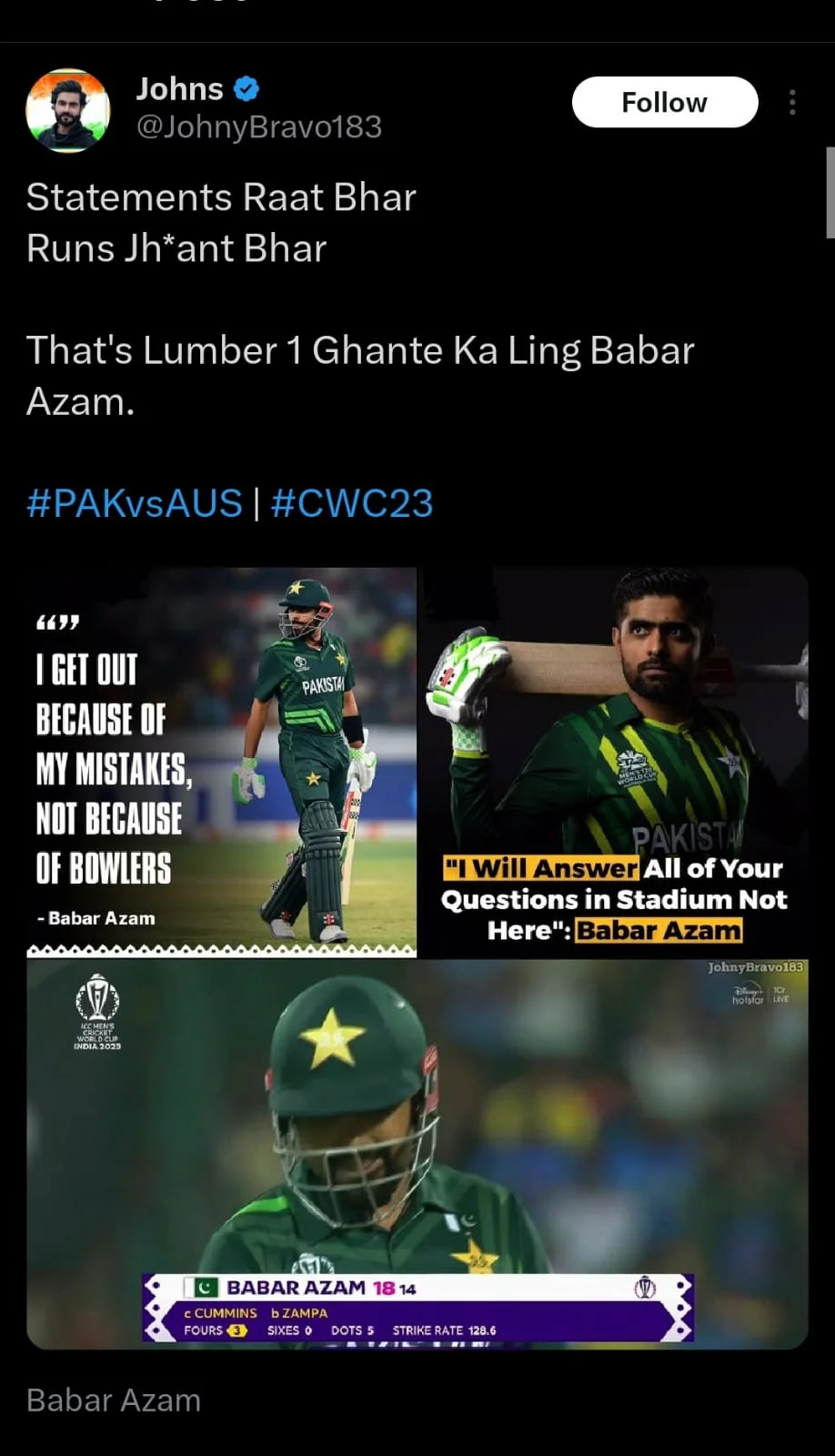 Babar Azam now has only 83 runs in 4 innings at this World Cup 2023. Since September, after his 151 vs Nepal, in his last 7 innings, Babar averages only 19 with a highest score of 50. This latest failure of Babar led to a spate of memes on Twitter.