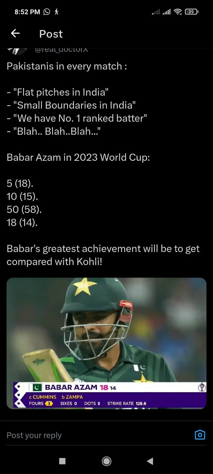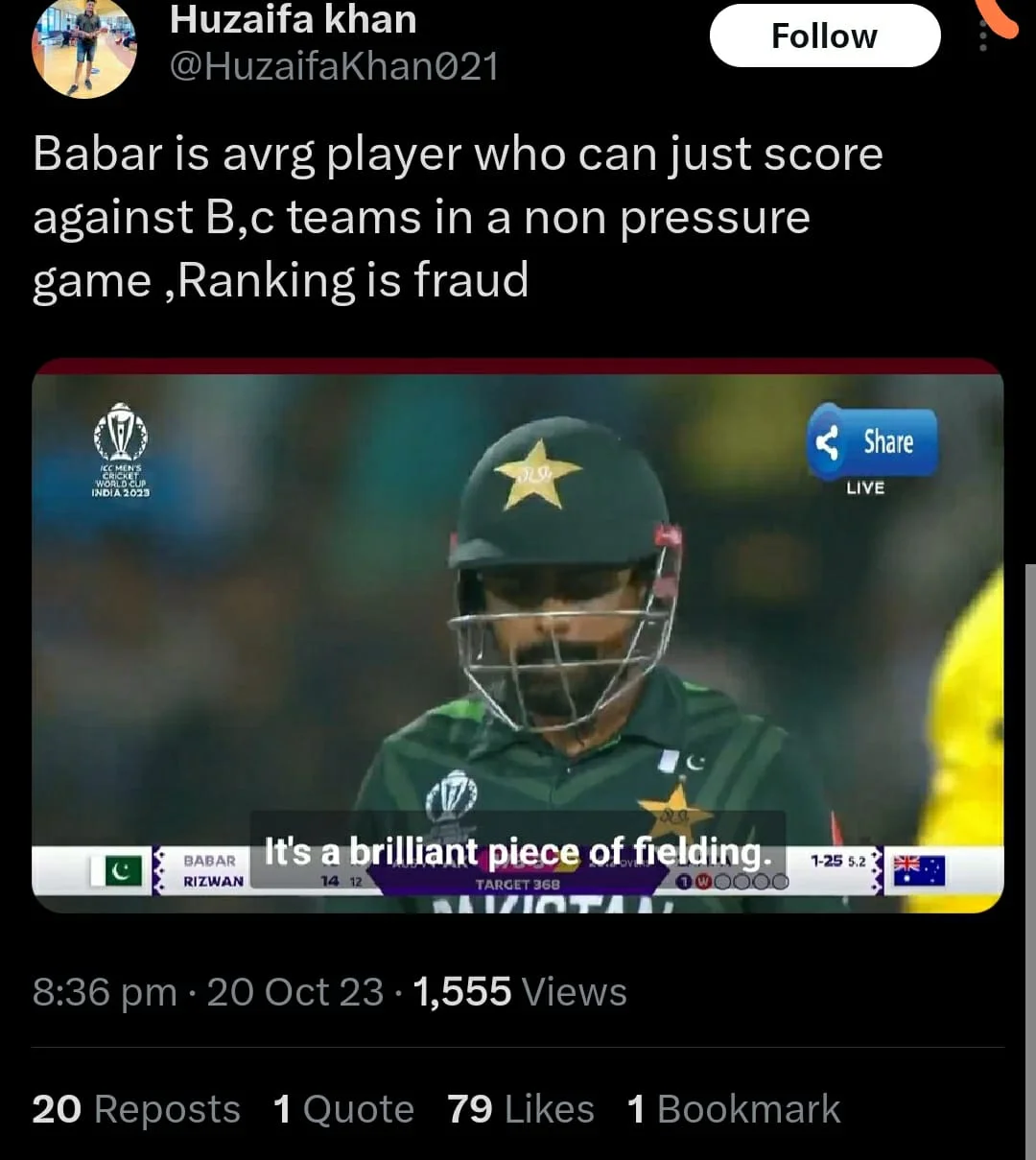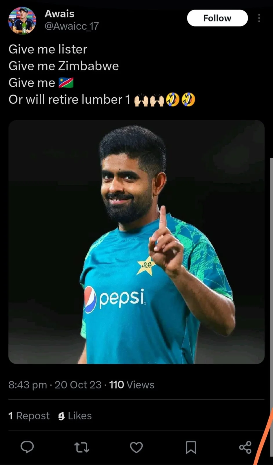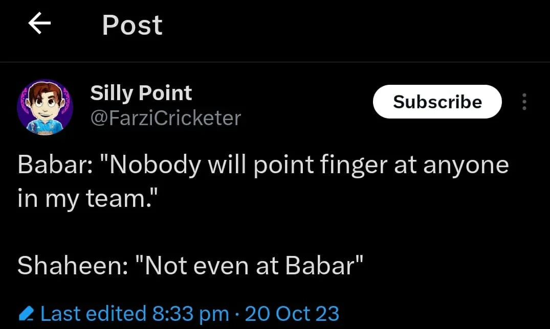 Babar Azam now has only 83 runs in 4 innings at this World Cup 2023. Since September, after his 151 vs Nepal, in his last 7 innings, Babar averages only 19 with a highest score of 50. This latest failure of Babar led to a spate of memes on Twitter.