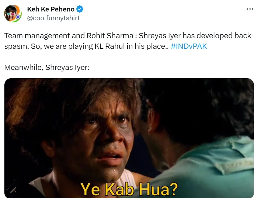 On Sunday, ahead of the India vs. Pakistan game, a team representative revealed that Iyer had a back spasm during warm-up. During the toss, Indian captain Rohit Sharma revealed that the problem was discovered during warm-up, and because of this Iyer will have to sit out.
