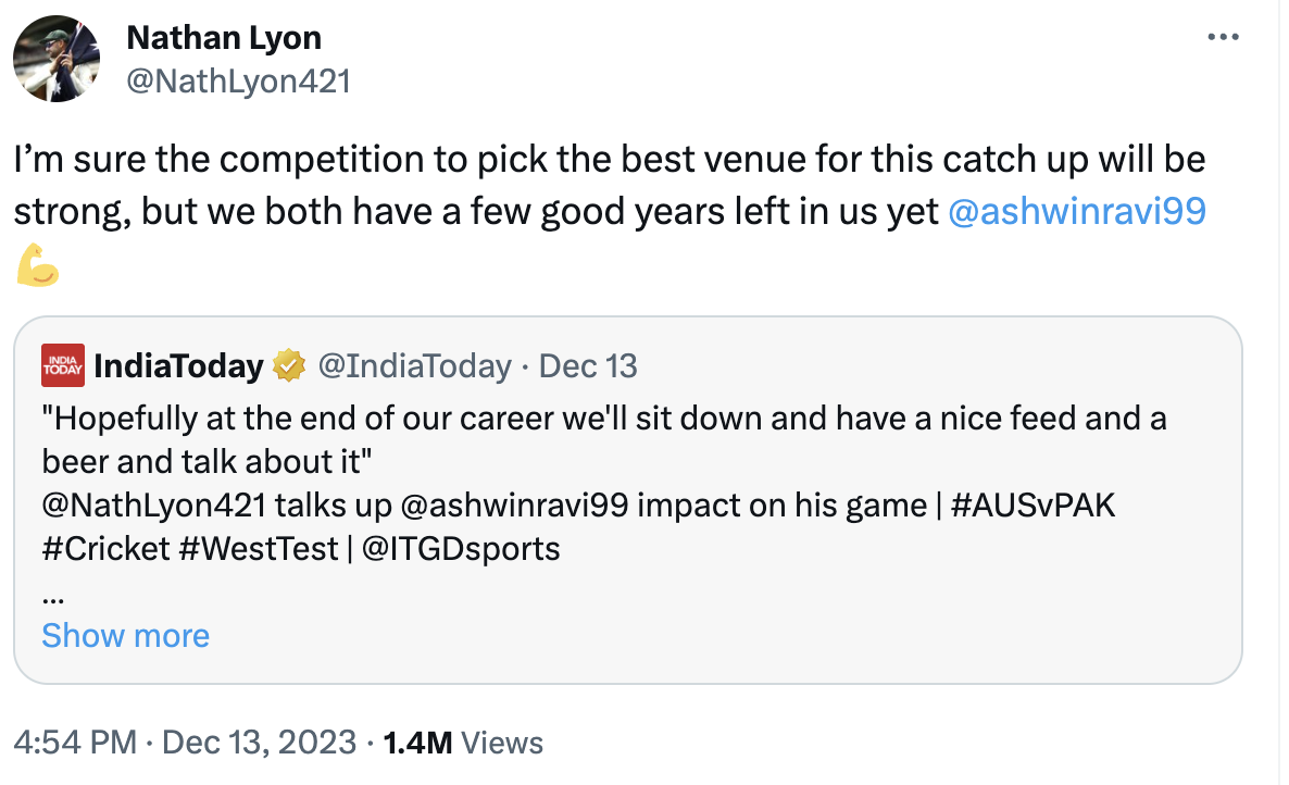 The admiration between Lyon and Ashwin spilled over onto social media, particularly on Twitter, where the two engaged in a lighthearted exchange. When a news agency shared Lyon’s interview, he responded by quoting the tweet and expressing anticipation for a catch-up with Ashwin. Lyon playfully mentioned the strong competition in choosing the best venue for their meeting, asserting that both still had a few good years left in their careers.