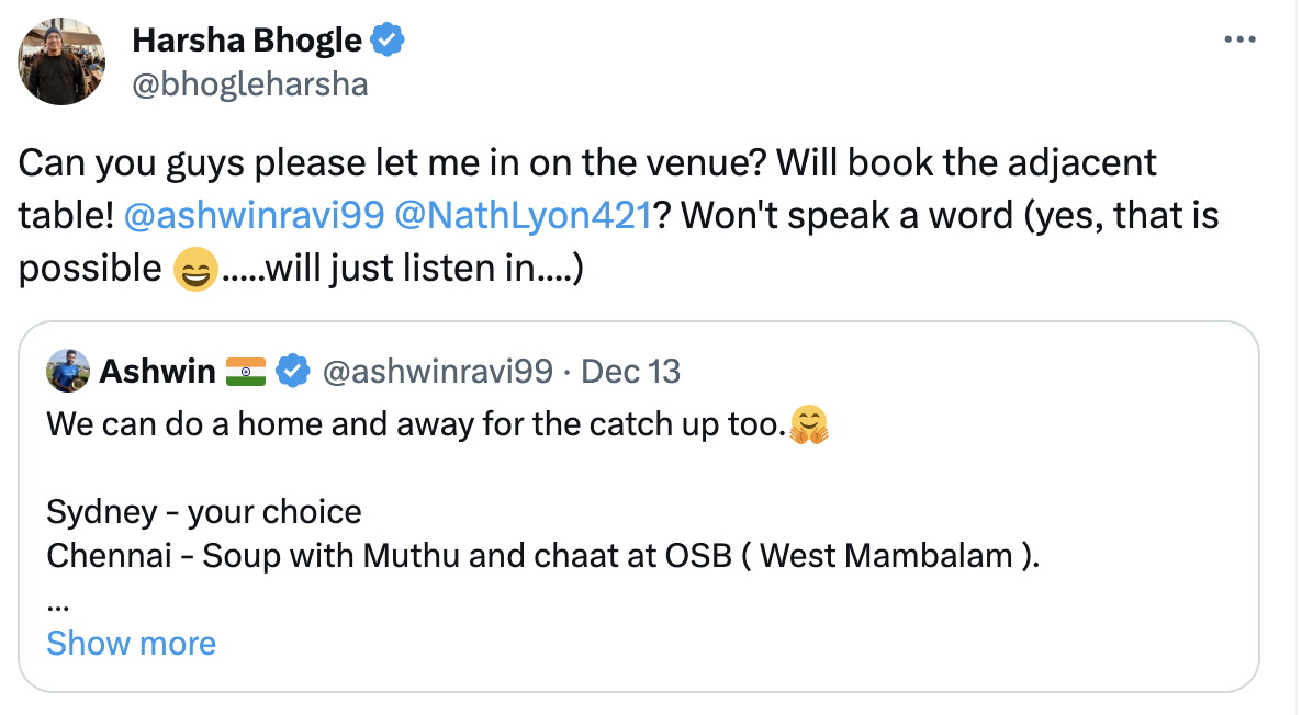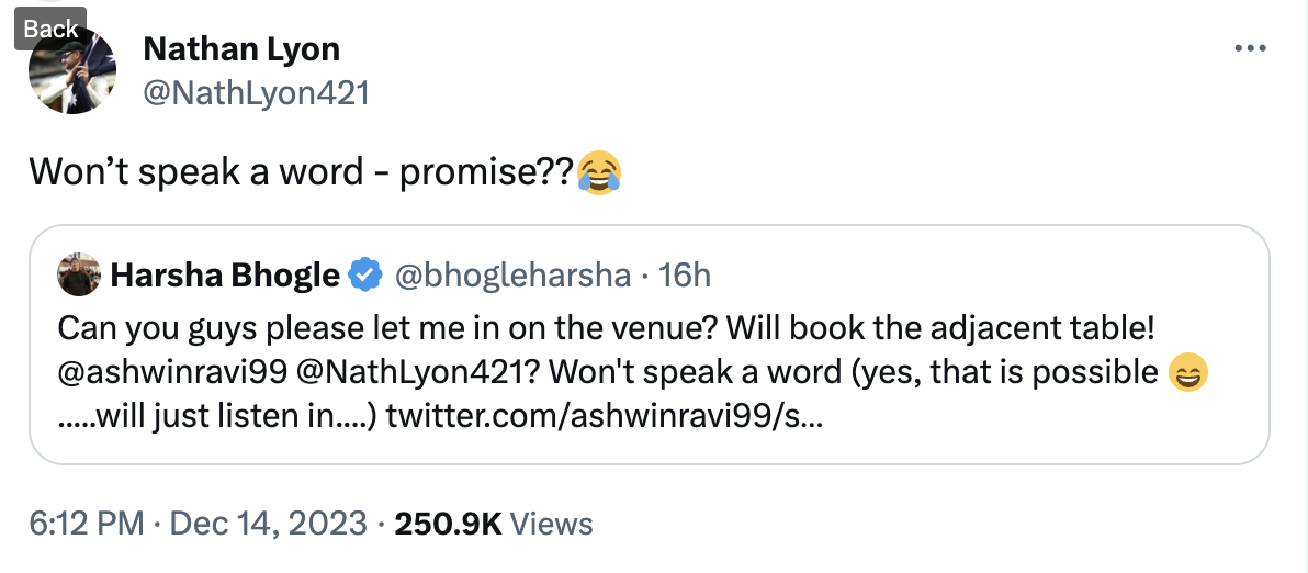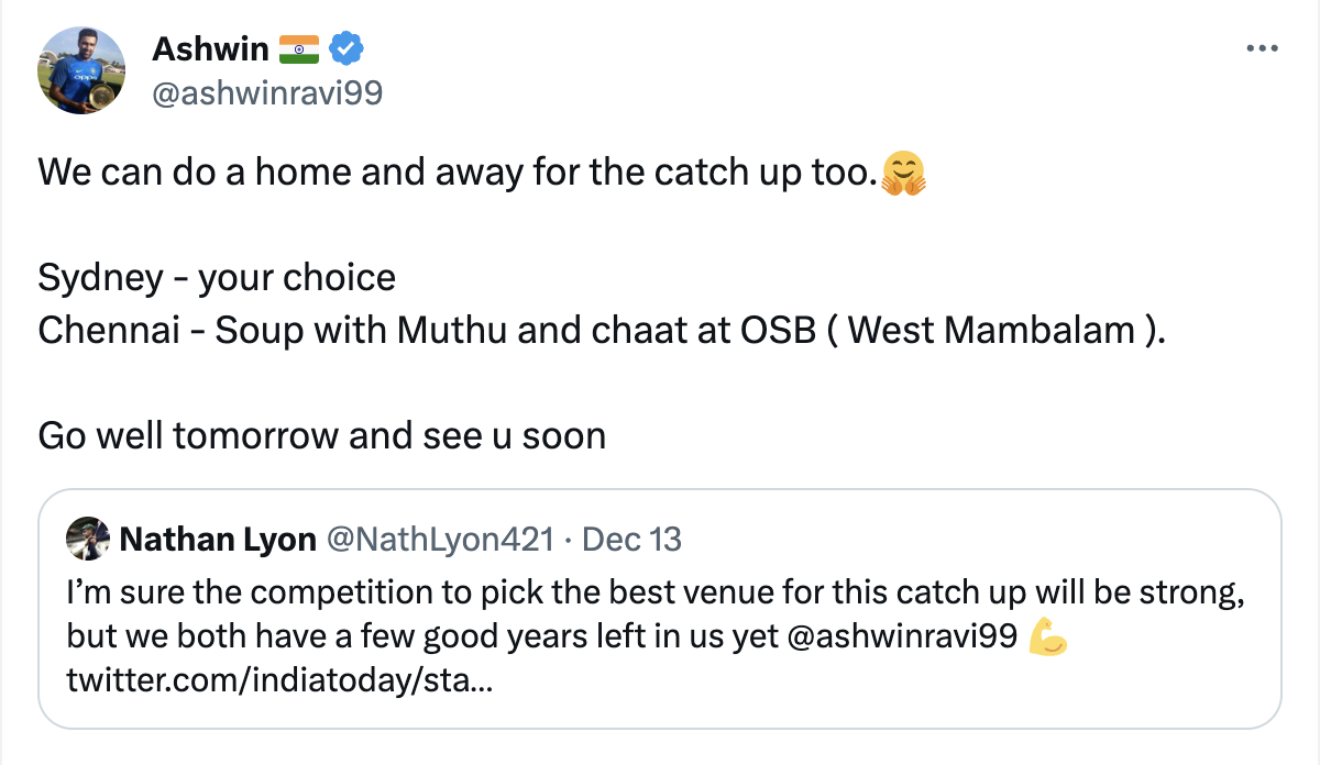 In a delightful response, Ashwin suggested a unique twist to their get-together, proposing a “home and away” arrangement for their meeting. He playfully invited Lyon to choose between Sydney and Chennai, offering specific plans for each location and showcasing the camaraderie beyond the cricketing field. Renowned cricket analyst Harsha Bhogle joined the banter, expressing his desire to be part of the rendezvous, to which Lyon humorously replied, “Won’t speak a word – promise??” adding a touch of humor to the exchange.
