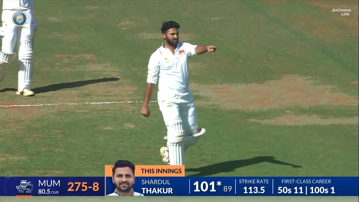 Shardul Thakur reached his first-ever first-class century in a brisk 89 balls, drawing widespread attention with his jubilant celebration. His innings culminated in a remarkable 109 runs off just 105 deliveries, featuring an impressive tally of 13 boundaries and 4 sixes. Thakur’s stellar performance came at a crucial juncture when Mumbai was struggling, turning the tide of the game in their favor. His century has put Mumbai in a commanding position, making them the frontrunners to clinch victory in the match.