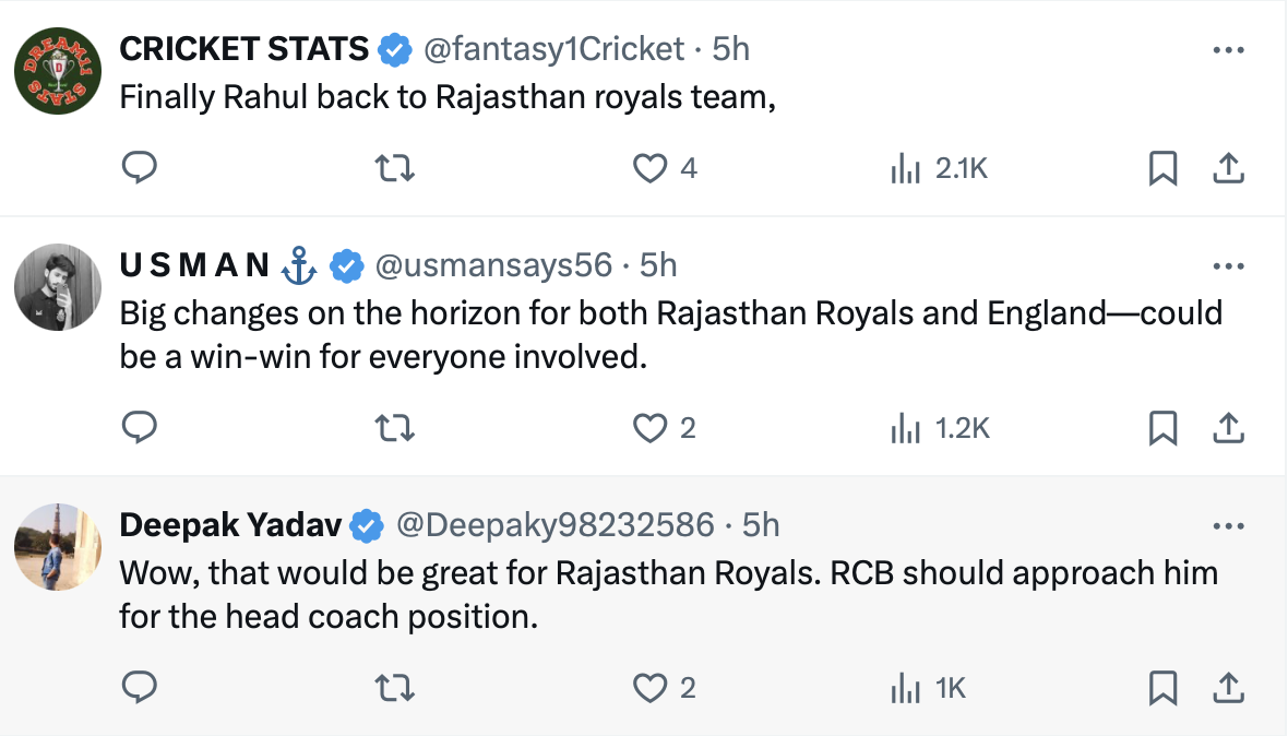 Under Dravid, Team India qualified for the final of the ICC T20 World Cup 2022, qualified for the final of the ICC World Test Championship 2023, qualified for the final of the ODI World Cup 202 without losing any game and now won the ICC T20 World Cup 2024 without losing any game. So, he will definitely turn out to be a good head coach option for the Royals.
