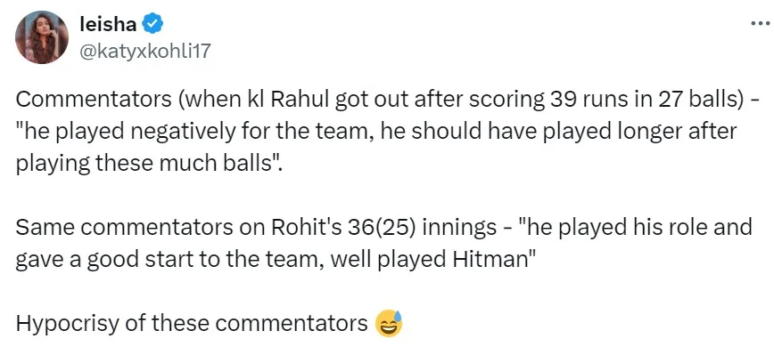 Meanwhile, fans on social media slammed commentators for their hypocrisy and biased behavior following Rohit Sharma’s knock. Several fans trolled the commentators for praising Rohit for his knock, and highlighted how the same commentators criticized KL Rahul, Virat Kohli after they played similar knocks.