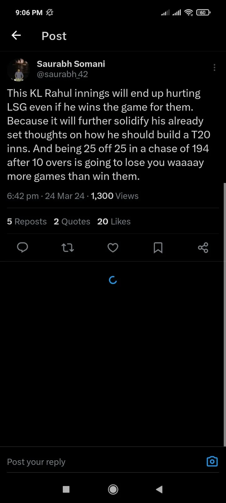 Rahul said, Bowled well in patches. The target wasn’t a lot. We made a few mistakes. Good to see Mohsin back. Naveen has been crucial for us. We will learn from the mistakes. We need to find ways to win games of cricket. Langer has bought a lot of calmness to the group. We enjoy having him around. Missing a season was really painful.