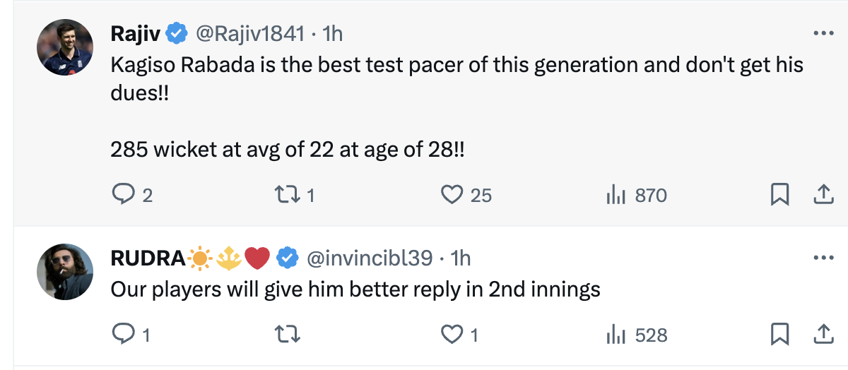 Kagiso Rabada’s exceptional performance on the field earned praise from fans and cricket pundits alike. Having bowled 17 overs in the day, Rabada has orchestrated a bowling masterpiece, claiming 5 crucial wickets while conceding just 44 runs. His spell has not only shifted the momentum but has become the focal point of discussions among cricket enthusiasts globally.
