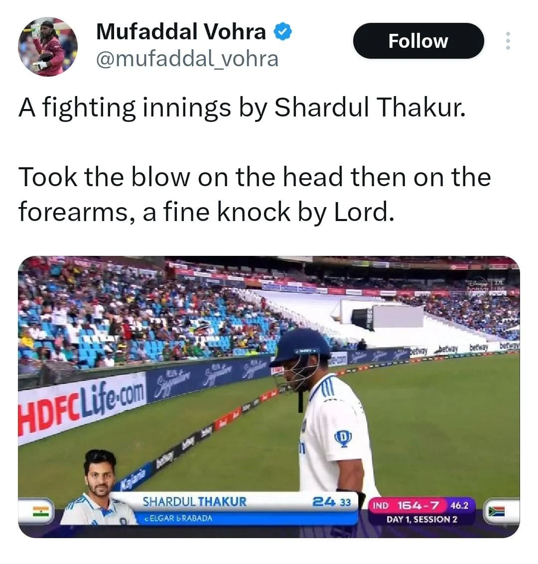 Shardul Thakur contributed 24 runs off 33 balls and formed a valuable 43-run partnership for the seventh wicket with KL Rahul. South Africa opted to bowl first in the opening Test, and after Thakur’s dismissal, India’s score stood at 164/7 in 46.2 overs.