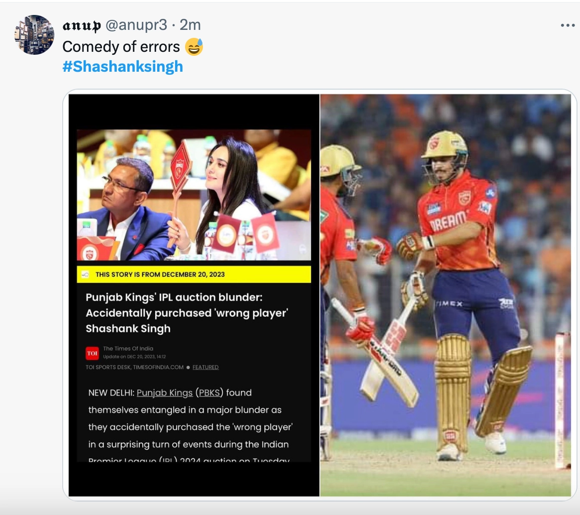 It was a stroke of luck for Shashank when Punjab Kings wasted no time in signing the talented, yet untested player. His name was called by auctioneer Mallika Sagar during the accelerated round of the mini-auction. There was some confusion during the auction when the bidding for Shashank ended, causing PBKS owners Ness Wadia and Preity Zinta to mistakenly think he was a different player. However, today he replied with the bat and won PBKS a match singlehandedly with his own efforts.