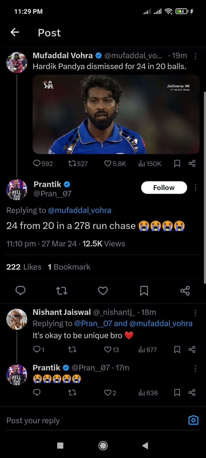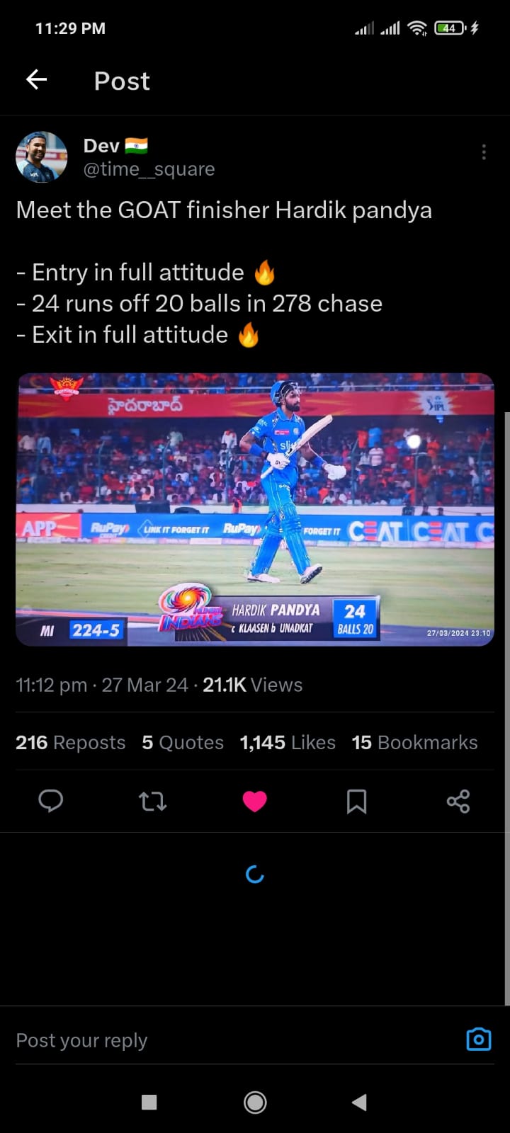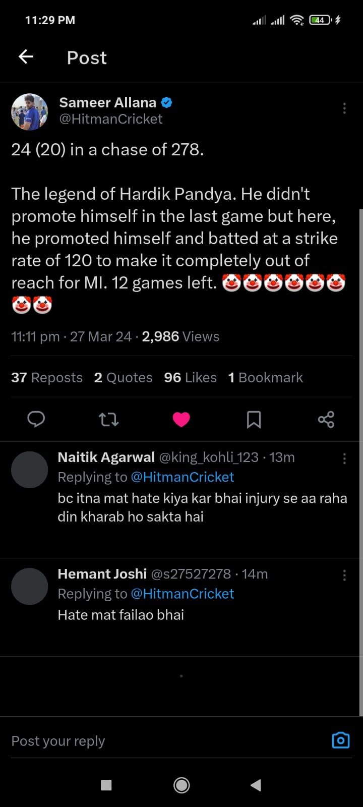 Mumbai Indians captain Hardik Pandya played a disastrous innings of 24 runs in 20 balls when chasing a record target of 278 runs against SRH. And he got trolled for his poor knock.