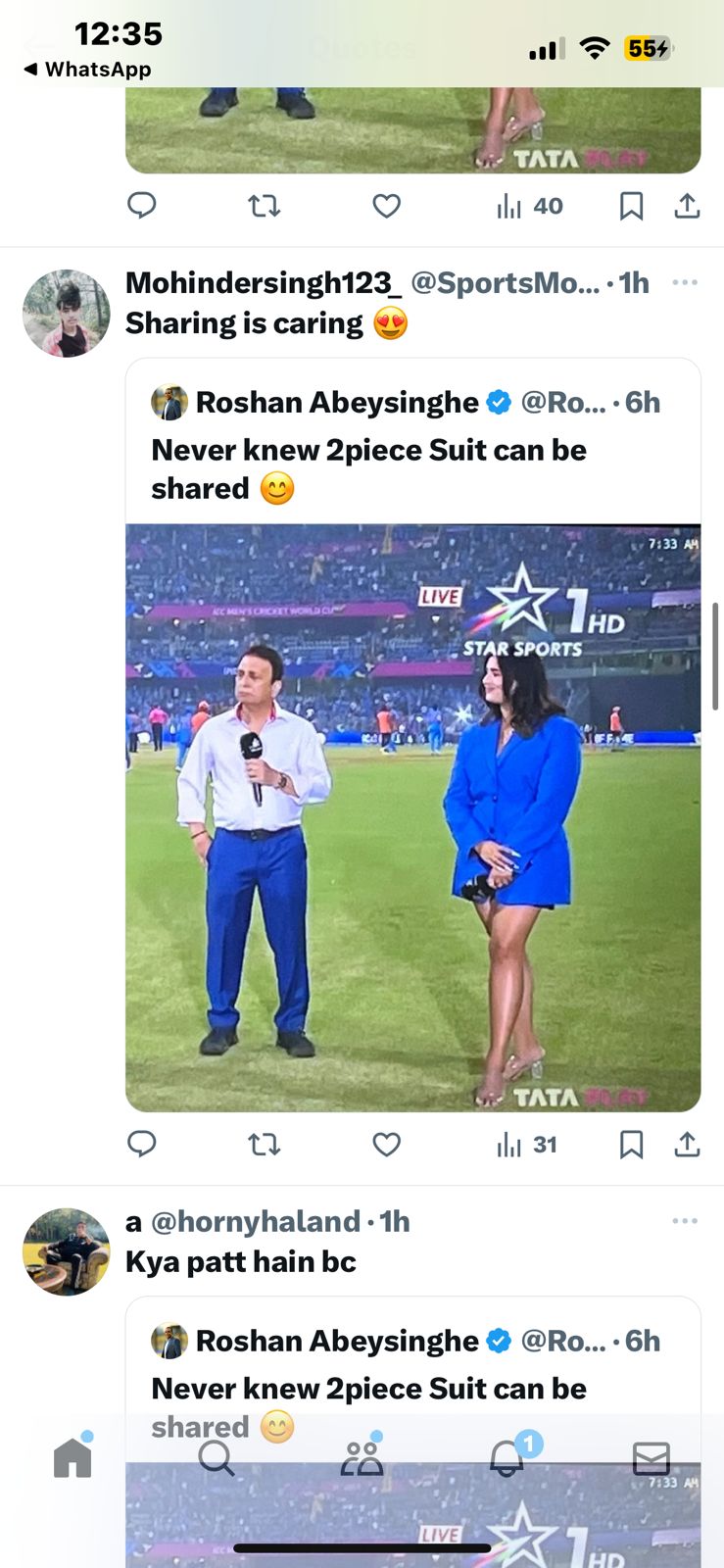 In a captivating mid-inning show during the semi-final clash between India and New Zealand at the Wankhede Stadium in Mumbai, the charismatic host Mayanti Langer engaged in a lively conversation with cricket legend Sunil Gavaskar. The visual spectacle was not confined to the thrilling game; it extended to Gavaskar, donned in a stylish blue trousers ensemble, and Mayanti, who sported an oversized blue blazer paired with a chic short skirt.