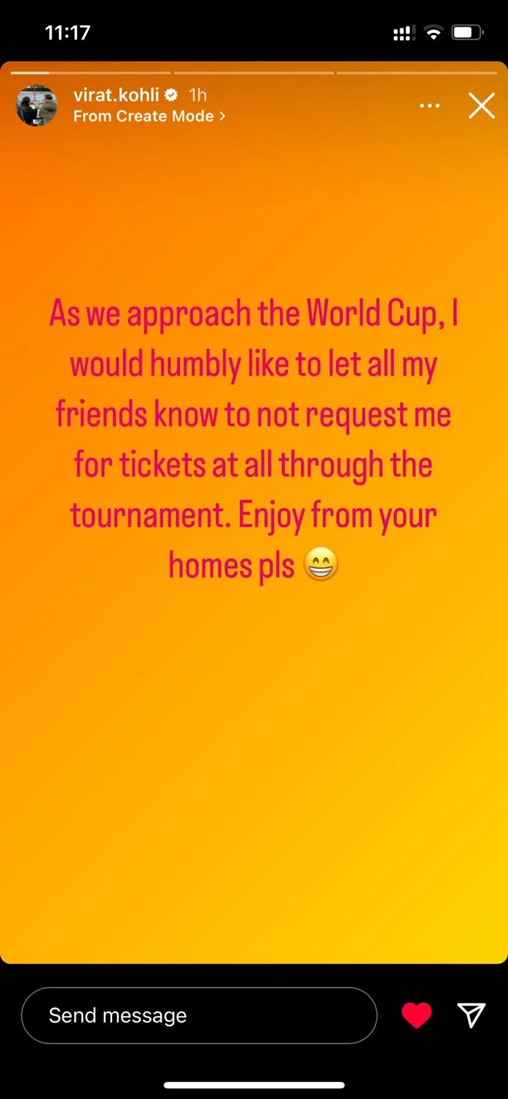 As the tournament is all set to start tomorrow, Indian batting superstar Virat Kohli has made a special appeal to his friends, who are likely to approach him for World Cup tickets. Virat Kohli took to his Instagram and sent a blunt message to his friends asking them to not ask him for the tickets. He wrote: