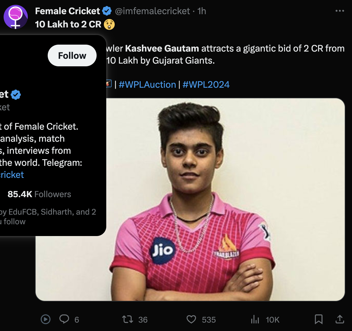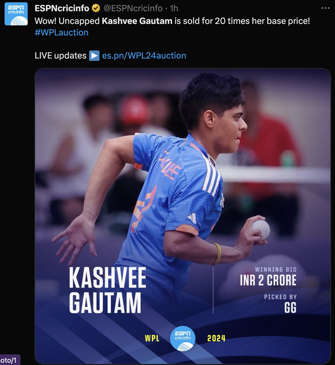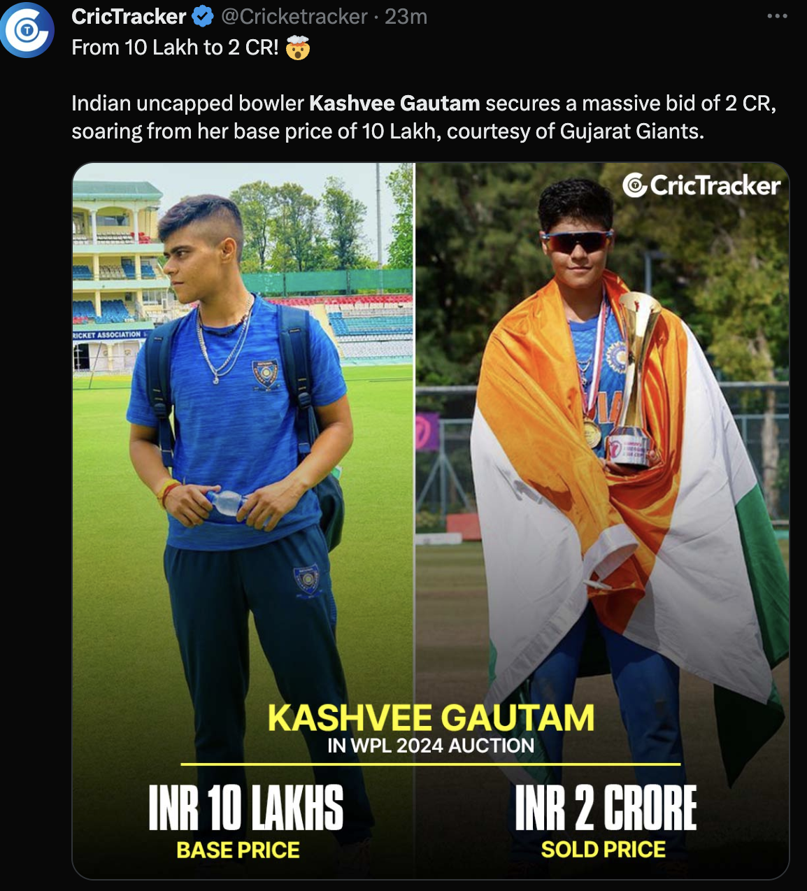 The culmination of Kashvee Gautam’s journey unfolded at the WPL 2024 auction, where the Gujarat Giants recognized her potential by securing her for a jaw-dropping 2 Crore INR. This move not only speaks volumes about her evolving skills but also signifies the unwavering belief that the team has in her ability to make significant contributions on the field.